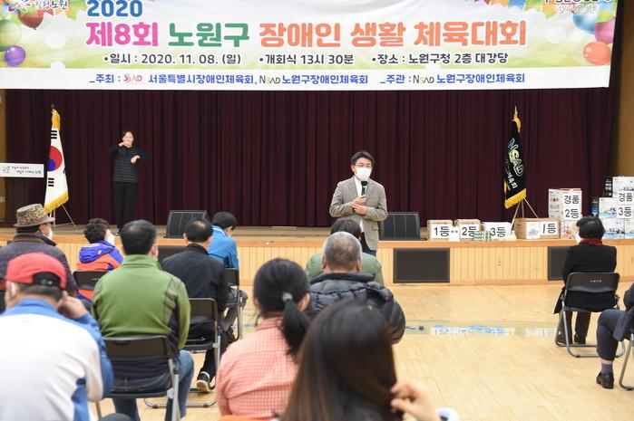 오승록 서울 노원구청장이 8일 장애인 생활체육의 활성화와 장애인복지 향상에 기여하기 위해 개최된 '2020 노원구 장애인 생활체육대회'에 참석했다. 사진은 이날 오 구청장이 축사를 하고 있는 모습. (사진제공=노원구청)