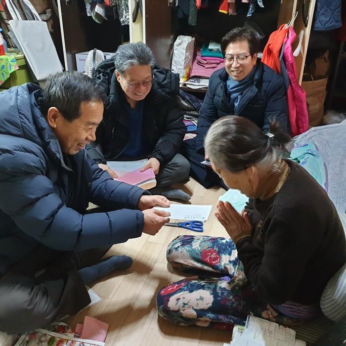 경기 남양주시 화도읍에 위치한 화도교회는 최근 설 명절이 다가옴에 따라 지역내 저소득 소외계층 5가구에 방문해 총 200만원의 성금을 전달했다. 사진은 화도교회 교인들이 홀몸노인 가구에 방문해 안부를 확인하고 성금을 전달하고 있는 모습. (사진제공=남양주시청)