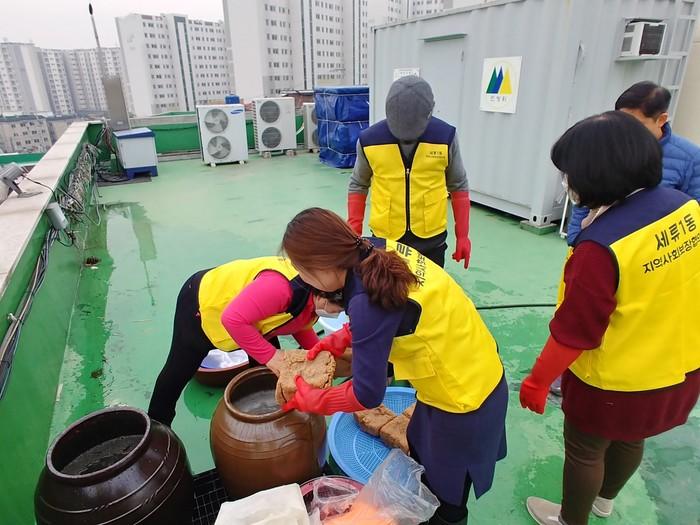 경기 수원시 권선구 세류1동 지역사회보장협의체는 지난 21일 올 추석에 소외되고 어려운 이웃에게 전달하기 위한 '사랑의 전통장(된장·간장) 담그기 사업'을 진행했다. 사진은 참여자들이 장을 담그고 있는 모습. (사진제공=권선구청)