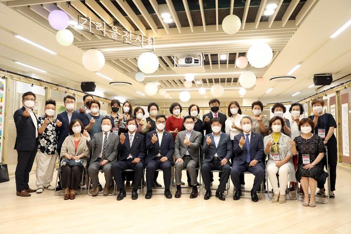 이정훈 서울 강동구청장이 지난 21일 길동 자치회관 수강생 및 지역내 주민들의 작품을 전시한 ‘길동기리울 마을전시회’에 참석했다. 전시회에는 서예·수채화 등 작품 100여점을 전시했으며, 오는 7월2일까지 평일 오전 10시~오후 6시 관람이 가능하다. 사진은 이날 이 구청장(앞줄 가운데)과 관계자들이 기념촬영을 하는 모습. (사진제공=강동구청)