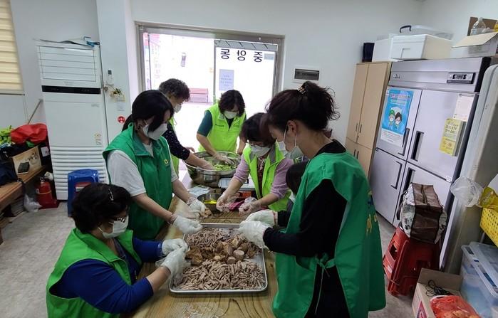 경기 동두천시 중앙동 새마을부녀회와 지역사회보장협의체는 최근 사랑의 밑반찬 나눔을 실시해 장조림·도라지무침 및 중앙동 착한식당인 '쭈니네 밥집'에서 후원한 코다리 조림을 지역내 홀몸노인 30여가구에 비대면으로 전달했다. 사진은 이날 봉사자들이 장조림 등 반찬을 만들고 있는 모습. (사진제공=동두천시청)