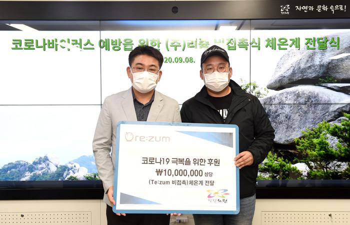 서울 노원구는 8일 (주)리쥼으로부터 코로나19 극복을 위한 비접촉식 체온계(1000만원 상당)를 기부받았다. 구는 기부받은 체온계를 이용자가 많은 지역내 사회복지시설에 배부할 예정이다. 사진은 전달식에서 오승록 구청장(왼쪽)과 관계자가 기념촬영을 하는 모습. (사진제공=노원구청)