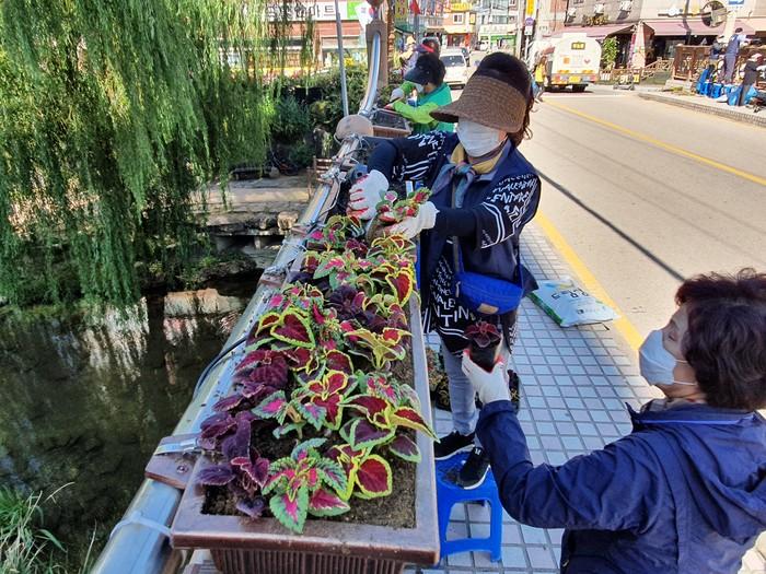 경기 수원시 팔달구 매교동은 24일 가을을 맞아 매교동 지역내 도로변 및 매세교 화분 거리에 천일홍, 메리골드, 코레우스 등 각양각색 고운 빛깔의 가을꽃을 식재했다. 이번 꽃 심기는 매교동 통장협의회, 주민자치위원회, 마을만들기협의회 등 단체원과 희망일자리6000 근로자 30여명이 참여했다. 사진은 참여자들이 꽃을 심고 있는 모습. (사진제공=팔달구청)
