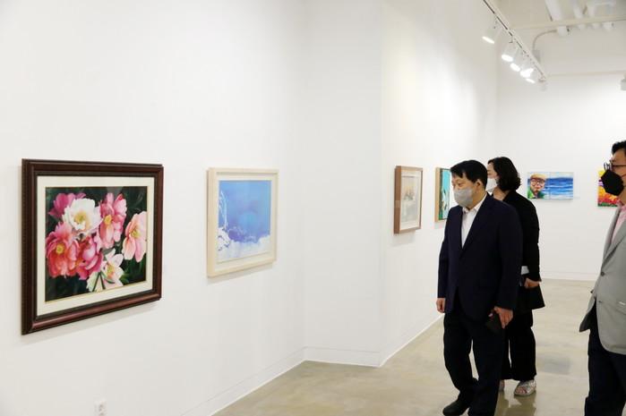 이성 서울 구로구청장이 2일 구로5동 구로구민회관 1층(갤러리 구루지)에서 열린 ‘제25회 잉벌노 미술전’에서 작품들을 관람하고 있다. 미술전에는 구로미술협회 소속 작가들의 작품 60여점이 오는 8일까지 전시된다. 사진은 이 구청장(왼쪽)이 전시 작품을 둘러보고 있는 모습. (사진제공=구로구청)