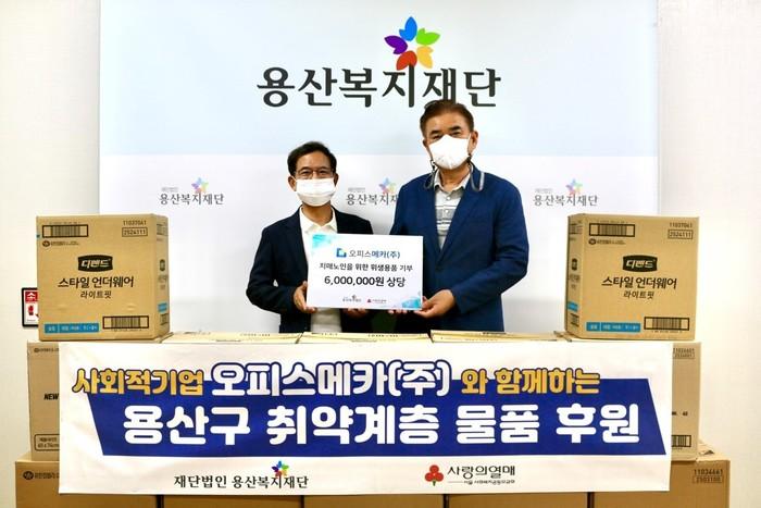 서울 용산복지재단에 최근 오피스메카(주)가 600만원 상당 생필품 지원을 약속했다. 지원은 올해 300만원씩 2회에 걸쳐 이뤄진다. 첫번째 기부 물품은 성인용 기저귀로 재단은 용산구치매안심센터 등을 통해 성인용 기저귀가 필요한 저소득 주민에게 전달할 예정이다. 사진은 전달식에서 관계자들이 기념촬영을 하는 모습. (사진제공=용산구청)