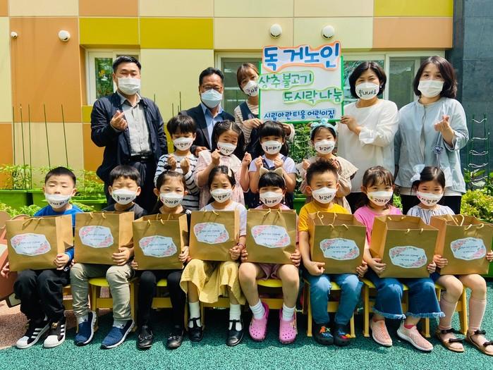 경기 하남시 풍산동 소재 시립아란티움 어린이집이 26일 코로나19로 장기화로 지친 지역내 홀몸노인 10가구에 원생들이 직접 키우고 수확한 상추로 만든 상추불고기 도시락을 전달했다. 사진은 아이들과 어린이집 관계자들이 기념촬영을 하는 모습. (사진제공=하남시청)