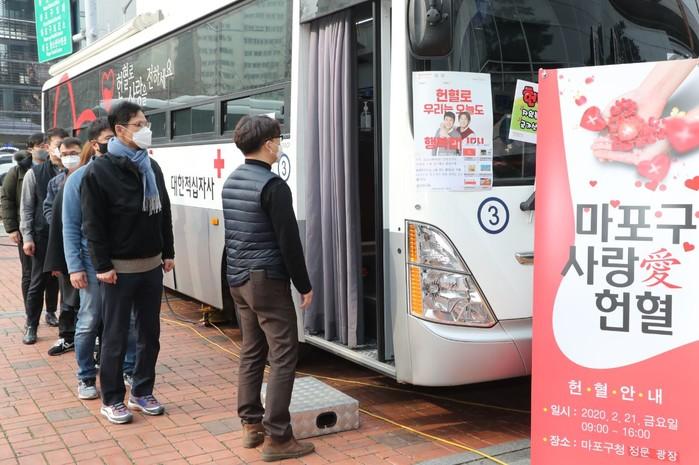 코로나19 확산에 따른 헌혈 수급에 차질이 빚어지고 있는 가운데 최근 서울 마포구 공무원 100여명이 구청 정문 광장에서 운영된 '마포구 사랑愛 헌혈' 차량에서 헌혈에 동참했다. 사진은 구 직원들이 헌혈을 하기 위해 대기하고 있는 모습. (사진제공=마포구청)