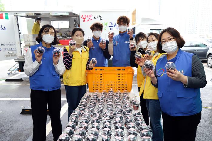 경기 안산시자원봉사센터 기업통합봉사단은 최근 신중회봉사단과 함께 살맛나는 생생이동밥차로 직접 조리한 짜장밥과 과일디저트 250인분을 안산시장애인복지관을 이용하는 장애인들의 가정에 직접 배달했다. 사진은 봉사자들이 과일디저트를 들고 기념촬영을 하는 모습. (사진제공=안산시청)