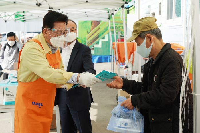 유덕열 서울 동대문구청장은 7일 밥퍼 무료급식소를 찾아 노인들의 안부를 묻고, 다일공동체 최일도 목사와 함께 도시락과 마스크 등 방역물품을 전달하는 등 봉사활동을 했다. 사진은 유 구청장(왼쪽)이 마스크를 나눠주고 있는 모습. (사진제공=동대문구청)
