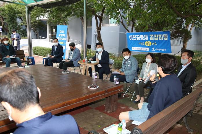 경기 이천시는 24일 현장소통 '이천은 화목해요'를 부발읍 청구아파트 주민들과 소규모 공감미팅으로 진행했다. 이천은 화목해요는 매주 화·목요일 지역내 아파트 주민들을 찾아가 여론을 청취하는 소통릴레이다. 사진은 간담회에서 엄태준 시장(왼쪽에서 네 번째)이 청구아파트 주민들과 대화를 하고 있는 모습. (사진제공=이천시청)