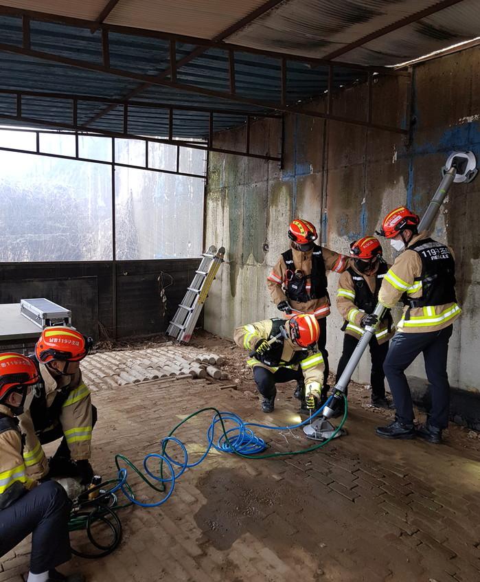 인천 남동소방서 119구조대는 11일 해빙기 각종 안전사고에 대비해 축대 붕괴사고 인명구조훈련을 했다. 이날 훈련은 매몰자 수색 및 인명구조, 공압지지대 이용한 붕괴건물 안정화 훈련 등으로 진행됐다. 사진은 훈련을 하고 있는 모습. (사진제공=남동소방서)