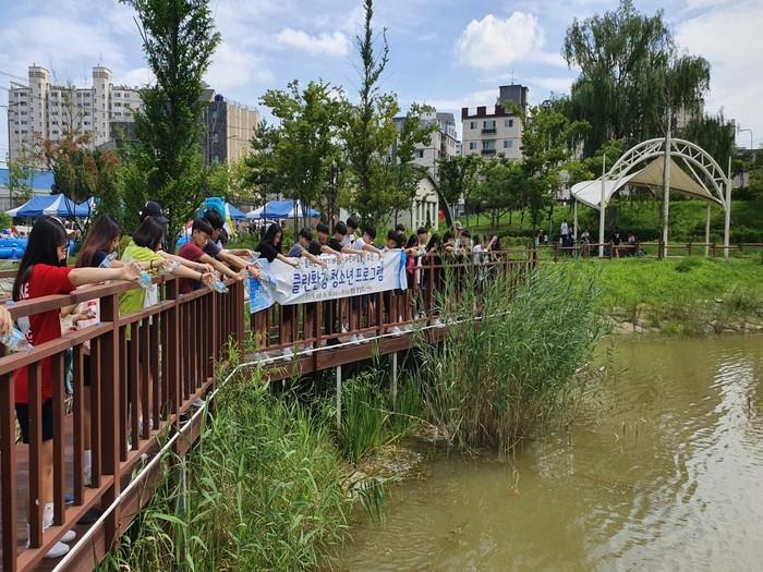 경기 수원시 권선구 평동 행정복지센터는 지난 10일 지역내 중·고등학생 자원봉사자 30명이 참여한 가운데 '클린환경 청소년 프로그램'을 진행했다. 사진은 학생들이 오목호수공원(오목천동 1171)에서 EM 발효액을 뿌리고 있는 모습. (사진제공=수원시청)