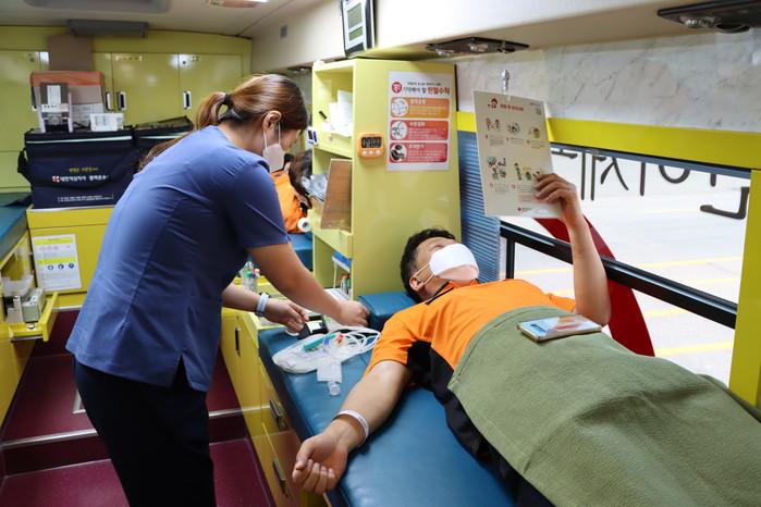 코로나19 장기화로 헌혈 인구가 감소하고 있는 가운데, 경기 군포소방서가 27일 혈액 수급 안정화를 위해 ‘사랑의 헌혈 행사’에 동참했다. 이동식 헌혈 차량과 함께 진행한 이번 헌혈에는 군포소방서 직원들이 자발적으로 참여했다. 사진은 소방서 직원이 헌혈을 하고 있는 모습. (사진제공=군포소방서)