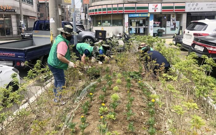 경기 수원시 장안구 율천동은 지난 1일 새마을지도자협의회와 함께 수원성교회 인근 마을버스 정류장 가로화단에 여름꽃 모종 300본을 식재하고 무단투기된 쓰레기도 함께 정리했다. 사진은 이날 참여자들이 화단에 꽃을 심고 있는 모습. (사진제공=장안구청)