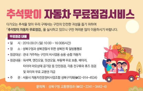 [시민일보 = 홍덕표 기자] 서울 성북구(구청장 이승로)가 추석을 맞아 고향을 방문하는 주민들의 안전한 차량 운행을 위해 오는 9월1일 구청과 성북경찰서 뒤편 성북천 쪽 일방통행로에서 '추석맞이 자동차 무상점검 서비스'를 실시한다.
