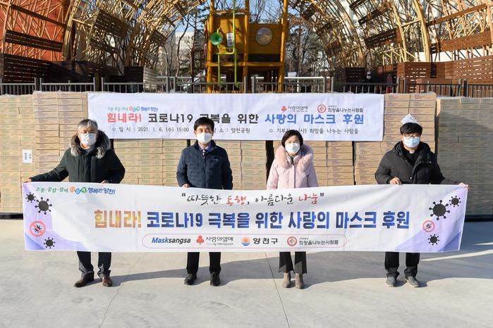 서울 양천구는 6일 희망을나누는사람들로부터 마스크 약 20만장(1억원 상당)을 전달받았다. 구는 마스크를 지역내 장애인 시설, 자활센터, 노숙인 시설, 다문화가족지원센터 등에 전달할 예정이다. 사진은 전달식에서 김수영 구청장(오른쪽에서 두 번째)이 관계자들과 기념촬영을 하는 모습. (사진제공=양천구청)
