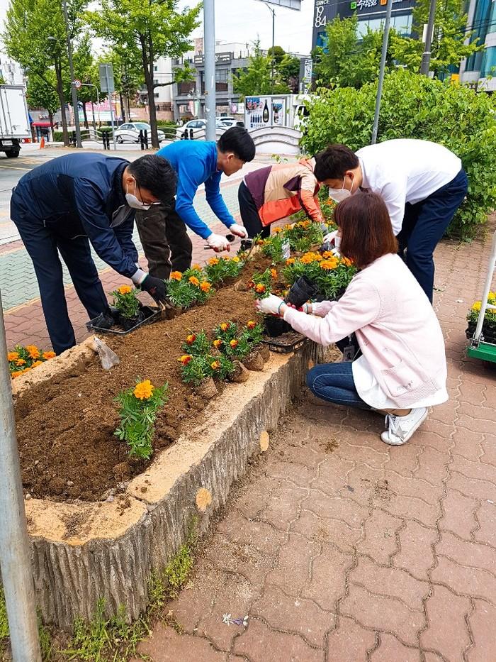 인천 남동구 간석4동이 20일 남동새마을금고 느티나무 봉사단과 함께 코로나19로 우울함에 빠져있는 주민들을 위해 '여름꽃 심기' 행사를 열었다. 이날 봉사단원 등은 주원고개 화단 및 교통섬에 메리골드 1000본을 식재했다. 사진은 꽃을 식재하는 모습. (사진제공=인천남동구청)