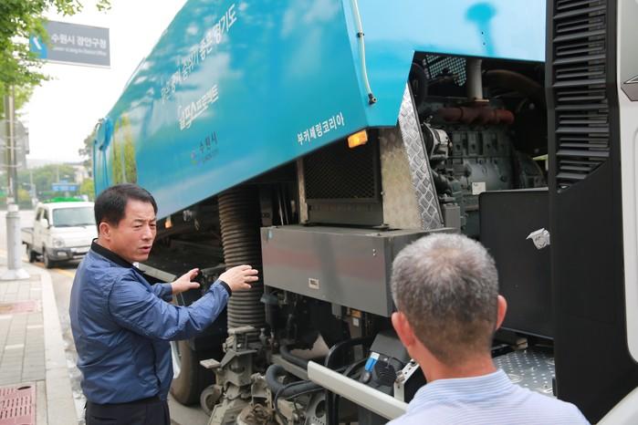 이병규 경기 수원시 장안구청장은 28일 오전 대형 노면청소차에 탑승해 도로 청소작업 현장을 점검했다. 이날 청소차에 탑승한 이 구청장은 1시간여에 걸쳐 도로 청소작업 현장을 참관하며 노면청소차 성능을 점검하고 차량 운전원의 업무상 애로사항에 대해 들었다. 사진은 이 구청장이 청소차량을 살펴보고 있는 모습. (사진제공=장안구청)