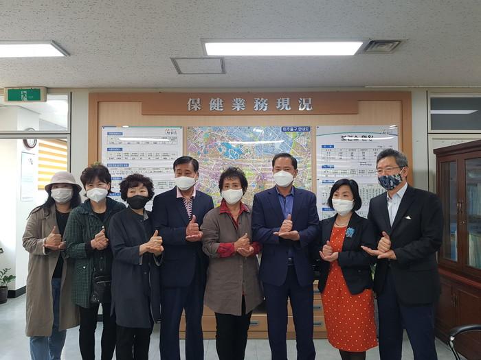 인천 미추홀구 여성단체협의회와 자유총연맹이 2일 구 보건소를 방문해 코로나19 대응 최일선에서 힘쓰고 있는 의료진과 관계자들에게 감사의 인사와 함께 떡과 수박, 컵라면 등을 전달했다. 사진은 의료진 등을 응원하며 기념촬영을 하는 모습. (사진제공=미추홀구청)