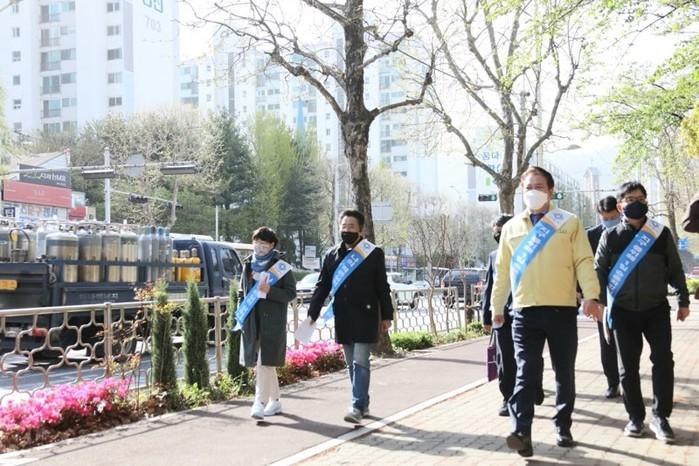 경기 안양시가 22일 제50주년 지구의 날을 맞아 본청 직원을 비롯한 산하 각 기관을 대상으로 자가용 운행 자제와 함께 대중교통 및 자전거를 이용한 출퇴근을 자율적 분위기 속에서 펼쳤다. 사진은 최대호 시장과 직원들이 도보로 출근하는 모습. (사진제공=안양시청)