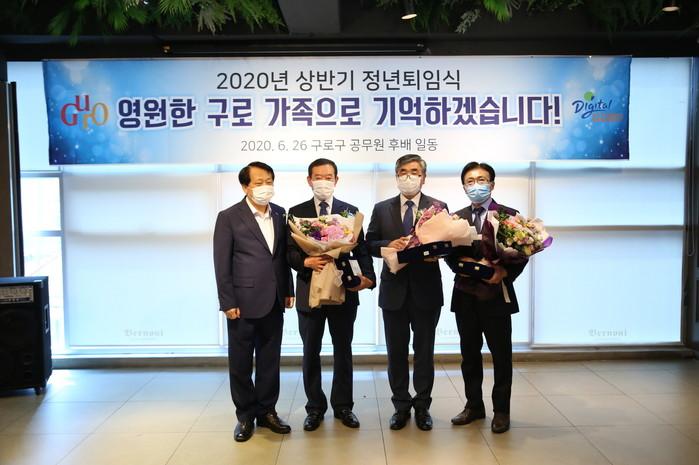 서울 구로구가 최근 호텔 베르누이에서 '2020년 상반기 퇴임식'을 개최했다. 이날 퇴임식에는 코로나19로 인해 퇴직자와 이성 구청장, 구청 간부 등 최소한의 인원만 참석했다. 사진은 이 구청장(왼쪽)이 퇴직자들과 기념촬영을 하는 모습. (사진제공=구로구청)