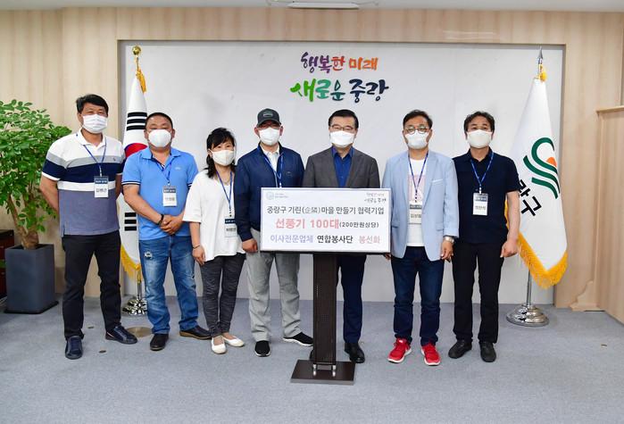 서울 중랑구가 최근 구청장실에서 전달식을 개최하고, 지역내 이사전문업체 연합봉사단 ‘봉선화’로부터 저소득층 가구를 위한 선풍기 100대를 전달받았다. 사진은 류경기 구청장(오른쪽 세 번째)이 관계자들과 기념촬영을 하는 모습. (사진제공=중랑구청)