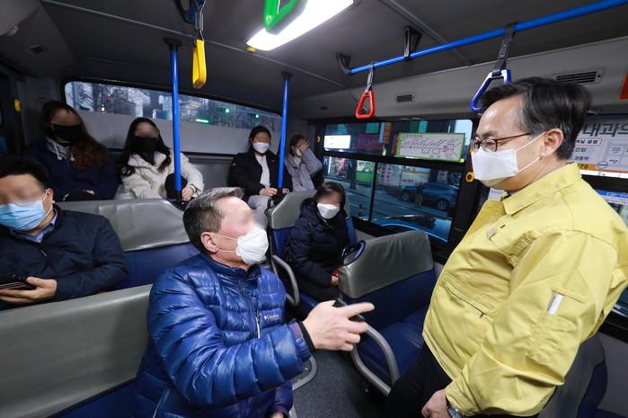 유성훈 서울 금천구청장이 11일 오후 6시쯤 코로나19 확진자가 발생한 '금천01번' 버스에 직접 탑승했다. 이는 지난 9일 구로5동에 거주하는 범일운수 금천01번 운수종사자 1명이 확진 판정을 받은 후 마을버스 이용을 불안해하는 주민들에게 안심의 메시지를 전달하기 위함이다. 사진은 유 구청장이 주민과 이야기를 하고 있는 모습. (사진제공=금천구청)