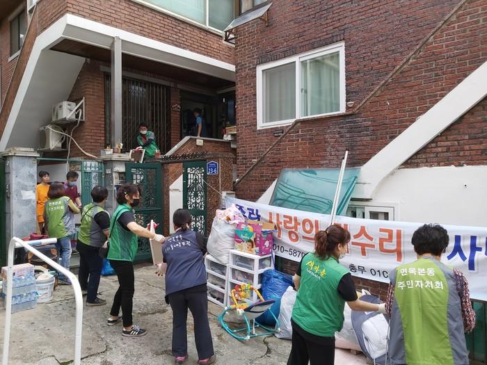 서울 중랑구 면목본동은 최근 주거환경 개선이 필요한 14남매 다둥이 가정에 집수리 봉사를 실시했다. 이날 봉사에는 중랑구 사랑의 집수리 봉사단 등 40여명이 참여했다. 사진은 봉사단이 사랑의 집수리를 하고 있는 모습. (사진제공=중랑구청)