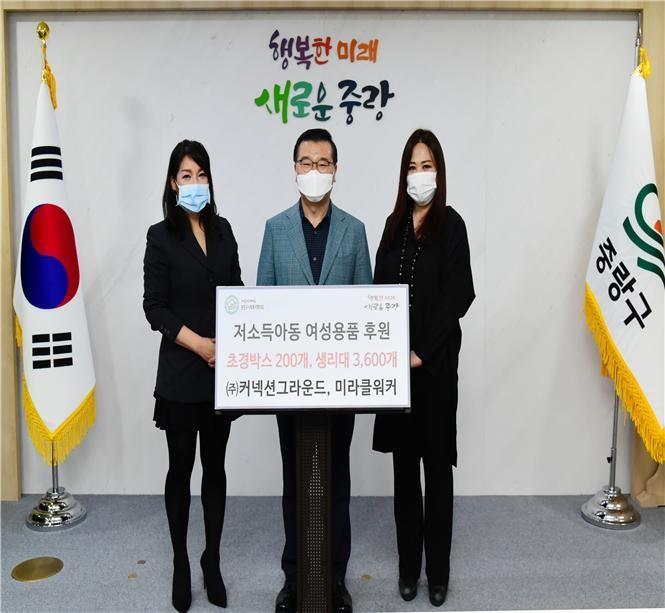 서울 중랑구는 최근 구청장실에서 (주)커넥션그라운드로부터 저소득층 아동 여성용품(초경박스 200상자, 생리대 1200상자)을 전달받았다. 구는 전달받은 후원품을 지역내 4개 초등학교 포함 총 6곳에 배부했다. 사진은 류경기 구청장(가운데)이 장소피아 (주)커넥션그라운드 대표 및 김미영 미라클워커 대표와 기념촬영을 하는 모습. (사진제공=중랑구청)
