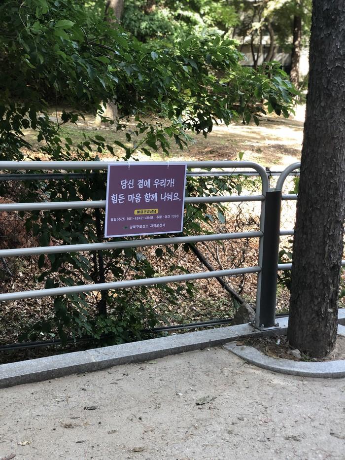 | ▲ 오동근린공원에 설치된 생명사랑 마음건강 푯말. (사진제공=강북구청) |
