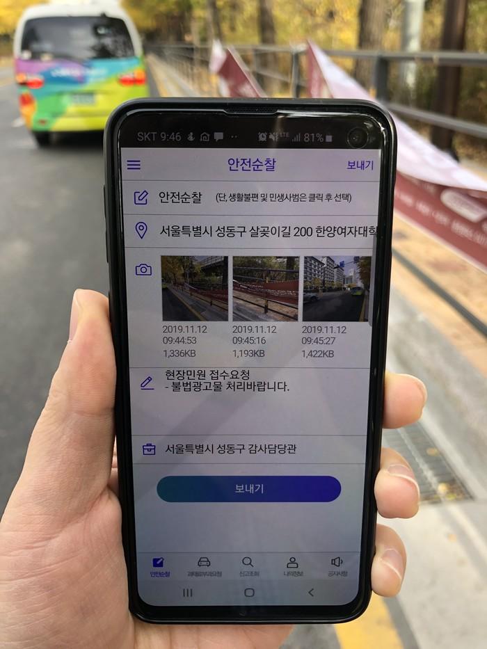 [시민일보 = 황혜빈 기자] 서울 성동구(구청장 정원오)가 올해 하반기부터 지역내 구민불편사항을 신속히 처리하기 위해 스마트 앱을 활용한 환경순찰을 운영하고 있다고 밝혔다.