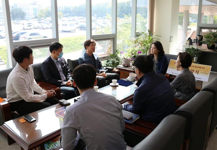 경기 안산시 평생학습관은 최근 다문화가족행복나눔센터와 다문화가정 평생학습 활성화를 위한 업무협약을 체결했다. 협약에 따라 양 기관은 다문화가정 활성화를 위한 프로그램 공동 개발 등에 힘쓰기로 했다. 사진은 의견을 나누는 모습. (사진제공=안산시청)