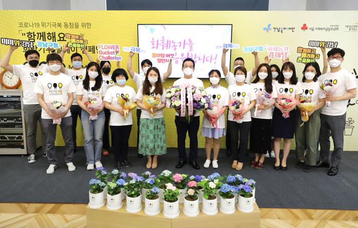 2일 정순균 서울 강남구청장이 조은희 서초구청장의 추천으로 코로나19로 어려움을 겪고 있는 화훼농가를 돕기 위해 ‘플라워 버킷 챌린지’ 캠페인에 참여했다. 사진은 꽃바구니를 들고 있는 정 구청장과 꽃다발을 들고 있는 구청직원들이 기념촬영을 하고 있는 모습. (사진제공=강남구청)