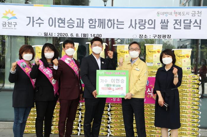 가수 이현승씨가 팬카페(동반자)회원들과 함께 지난 8일 서울 금천구 지역 취약계층을 위해 쌀 10kg 100포를 전달했다. 이날 오후 2시 금천구청 광장에서 유성훈 구청장, 이씨와 팬카페 회원들이 참석한 가운데 전달식이 진행됐다. 사진은 유 구청장(오른쪽 두 번째) 및 이씨(오른쪽 세 번째)가 기념촬영을 하는 모습. (사진제공=금천구청)