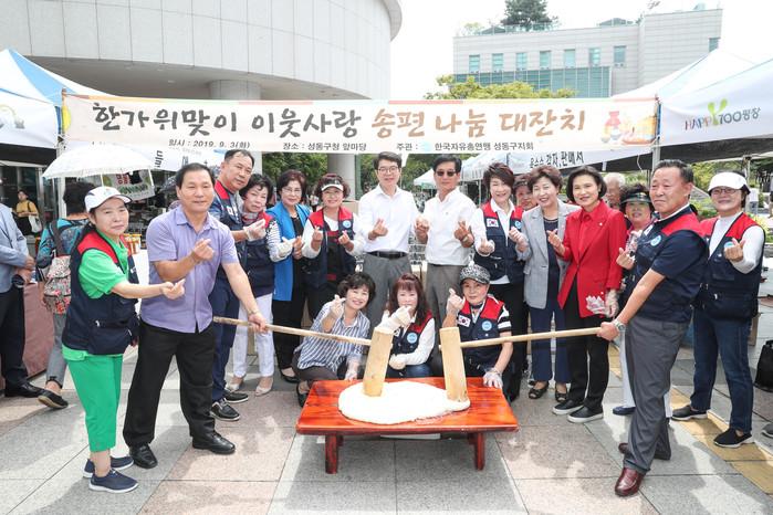 한국자유총연맹 서울 성동구지회는 3일 구청 앞 광장에서 회원 및 방문객 300여명이 참석한 가운데 ‘추석맞이 사랑의 송편 나눔행사’를 개최했다. 이날 만든 송편은 저소득 취약계층 255가구에 전달된다. 사진은 떡메치기를 하는 모습. (사진제공=성동구청)