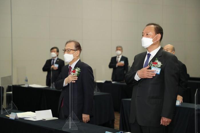 유동균 서울 마포구청장이 최근 민주평통 자문위원 연수에 참석했다. 이번 연수에서는 '새로운 정세 전개와 남북합의 이행을 위한 민주평통의 역할'을 주제로, 한반도 평화프로세스 재가동을 위한 정책 등이 논의됐다. 사진은 연수에서 유 구청장과 정세현 수석부의장이 국민의례를 하고 있는 모습. (사진제공=마포구청)