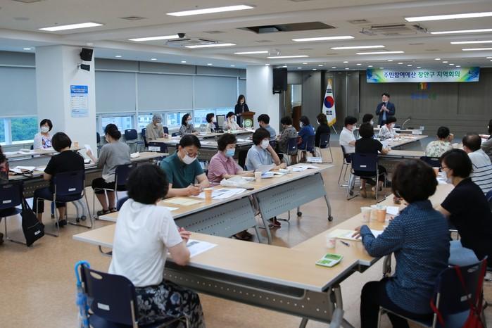 경기 수원시 장안구는 27일 구청 대회의실에서 주민참여예산 제안사업 심의를 위한 제3차 장안구 지역회의를 개최했다. 이날 회의에서는 공개 모집으로 접수된 제안사업 54건 중 반영 가능한 21건의 사업에 대해 우선순위를 정했다. 사진은 참여자들이 회의하는 모습. (사진제공=장안구청)