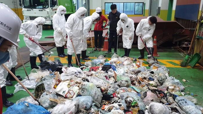 경기 수원시 장안구 영화동은 30일 동 단체장 및 지역내 주민들과 함께 수원시 자원회수시설(수원시 영통구 위치)에서 '생활폐기물 샘플링 검사'를 실시했다. 사진은 관계자들이 검사를 진행하는 모습. (사진제공=수원시청)