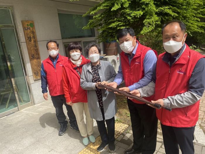 경기 동두천시 불현동 주민자치위원회는 최근 어버이날을 맞아 건강과 장수를 기원하며 직접 제작한 ‘구구팔팔, 孝 장수지팡이’ 50여자루를 지역내 경로당 33곳에 전달했다. 사진은 전달식에서 관계자들이 기념촬영을 하는 모습. (사진제공=동두천시청)