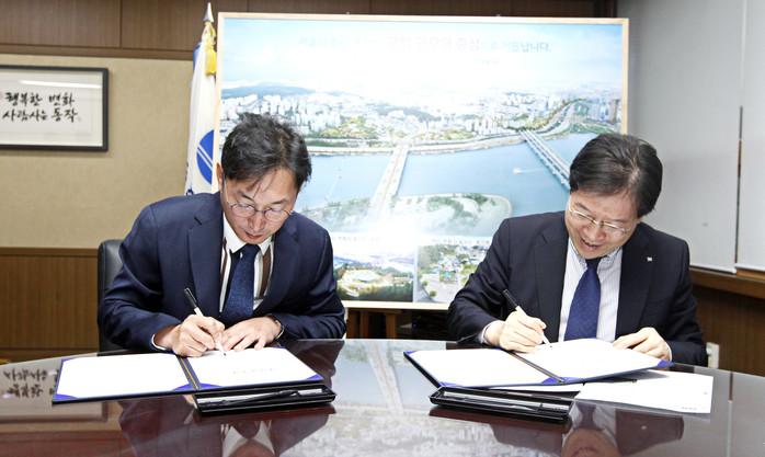 서울 동작구와 서울주택공사(SH)는 지난 6일 동작구청에서 상도1동 및 사당1동 공영주차장 부지를 복합개발하기로 합의하고 업무협약을 체결했다. 이번 업무협약에 따라 구는 SH와 함께 오는 2020년부터 상도1동 청석 거주자우선 주차장(1068㎡)과 사당1동 한누리 공영주차장(1323㎡) 부지에 행복주택 복합건물을 착공할 예정이다. 사진은 이창우 구청장(왼쪽)과 김세용 사장이 협약서에 서명을 하고 있는 모습. (사진제공=동작구청)