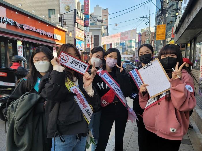 서울 은평구 청소년대표자회의 ‘보이스’는 최근 연신내 로데오거리 52개 업소에 금연스티커를 부착하고 꽁초 쓰레기통을 배부하며 청소년 술판매 금지 등을 주제로 유해환경개선 캠페인을 진행했다. 사진은 이날 캠페인에 참가한 청소년들이 기념촬영을 하는 모습. (사진제공=은평구청)