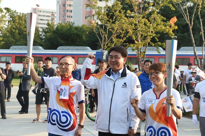 서울 노원구는 30일 경춘선숲길 방문자센터에서 ‘제100회 전국체전 및 제39회 전국장애인체전 성화봉송’ 출발행사를 개최했다. 사진은 행사에 참석한 오승록 구청장(가운데)과 성화봉송 주자들이 함께 기념촬영을 하는 모습. (사진제공=노원구청)