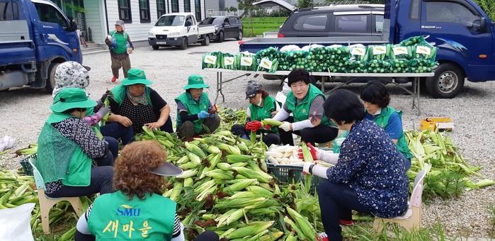 경기 포천시 가산면 새마을지도자협의회가 27일 취약계층을 위해 직접 정성껏 재배한 옥수수를 수확했다. 이날 수확한 옥수수는 가산면 부녀회를 통해 마을별 어려운 이웃에게 전달될 예정이다. 사진은 수확한 옥수수를 다듬고 있는 회원들의 모습. (사진제공=포천시청)