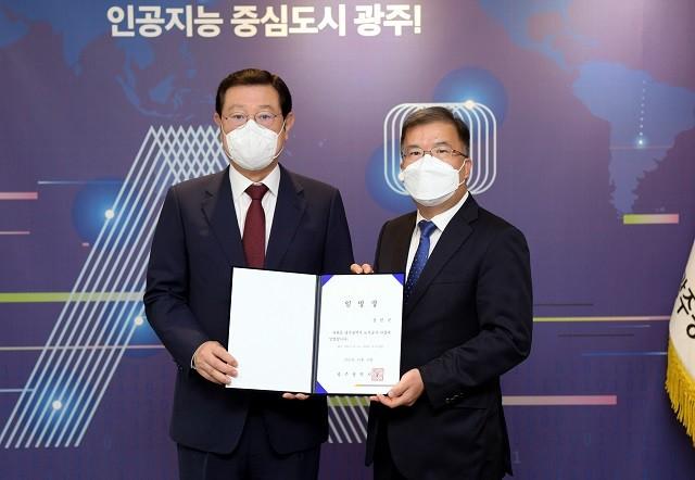 [광주=정찬남 기자] 이용섭 광주광역시장(좌측)이 8일 오전 시청 접견실에서 정민곤 광주도시공사 사장에게 임명장을 수여한 후 기념촬영을 하고 있다.