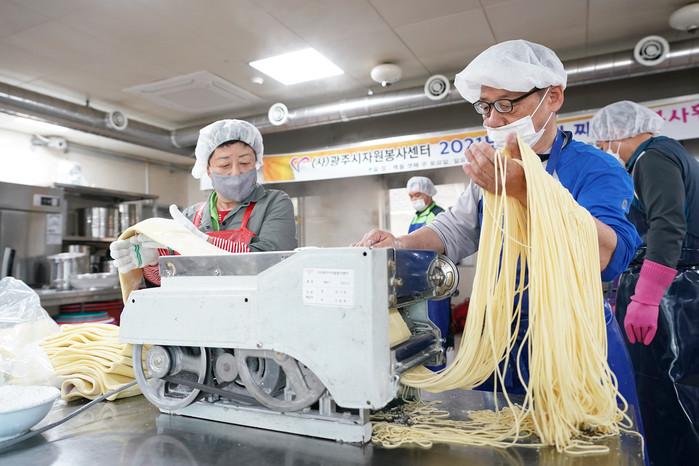 경기 광주시 그리니크리니 봉사단과 기동순찰대 청소년유해환경감시단은 지난 18일 짜장면 640인분을 만들어 사회복지시설 13곳에 전달했다. 사진은 봉사자들이 짜장면 면발을 뽑고 있는 모습. (사진제공=광주시청)