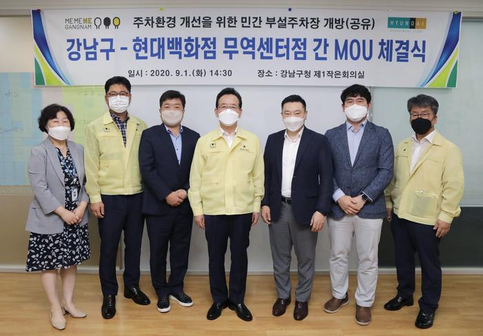 서울 강남구가 1일 삼성동 소재 현대백화점 무역센터점과 부설주차장 개방 및 공유를 위한 업무협약을 체결하고, 오는 10월부터 거주자우선주차 방식으로 개방하기로 했다. 사진은 업무협약식에서 정순균 구청장(가운데)이 관계자들과 기념촬영을 하는 모습. (사진제공=강남구청)