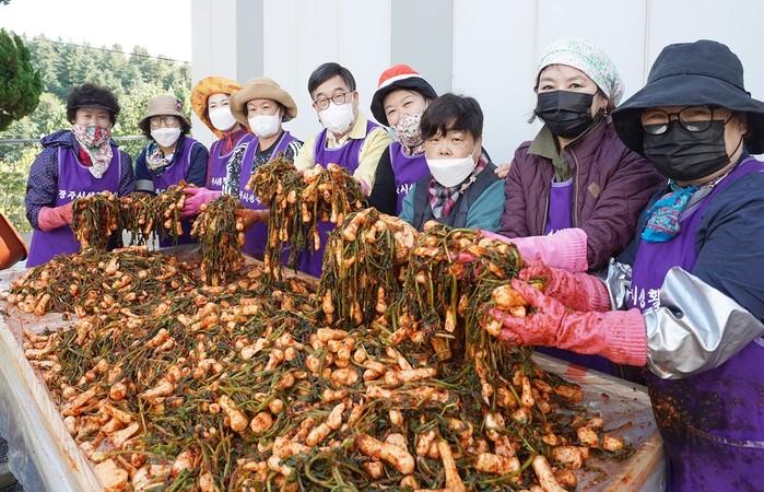 생활개선경기광주시연합회는 최근 ‘이웃사랑 김장김치 나눔’ 행사를 개최해 직접 수확한 알타리무로 김치를 담갔다. 이번에 담근 김치는 홀몸노인 등 취약계층 200가정에 전달할 계획이다. 사진은 행사에 참가한 신동헌 시장(가운데)이 봉사자들과 김치를 만들고 있는 모습. (사진제공=광주시청)