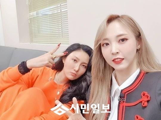공개된 사진 속에는 나란히 앉아 브이포즈를 취한 화사와 문별의 모습이 담겼다.