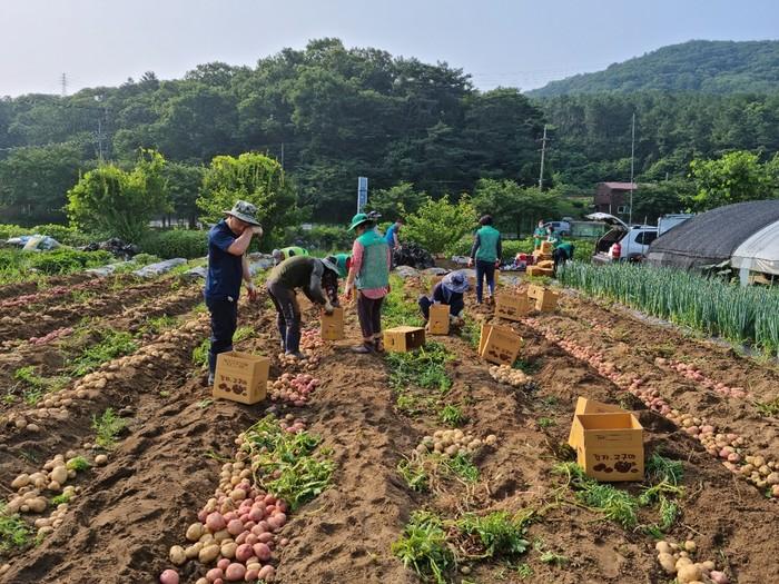 경기 광주시 남한산성면 새마을가족은 최근 하번천리에 위치한 새마을 농장에서 지난 4월에 직접 심고 관리해온 감자 100상자를 수확했다. 이날 수확한 감자는 전량 지역내 홀몸노인 등 저소득층에 전달될 예정이다. 사진은 이날 봉사자들이 감자를 수확하고 있는 모습. (사진제공=광주시청)