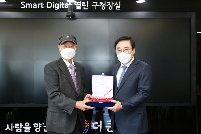 이동진 서울 도봉구청장이 최근 도봉구청을 방문한 도봉구 게이트볼 연합회로부터 감사패를 전달받았다. 이 구청장은 지역 게이트볼 동호인의 오랜 숙원이었던 다락원 게이트볼 전용구장 설립과 지속적인 지원으로 연합회 발전과 활성화에 기여한 공로를 인정받아 감사패를 받았다. 사진은 이 구청장(오른쪽)이 도봉구 게이트볼 연합회장으로부터 감사패를 전달받고 있는 모습. (사진제공=도봉구청)